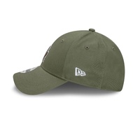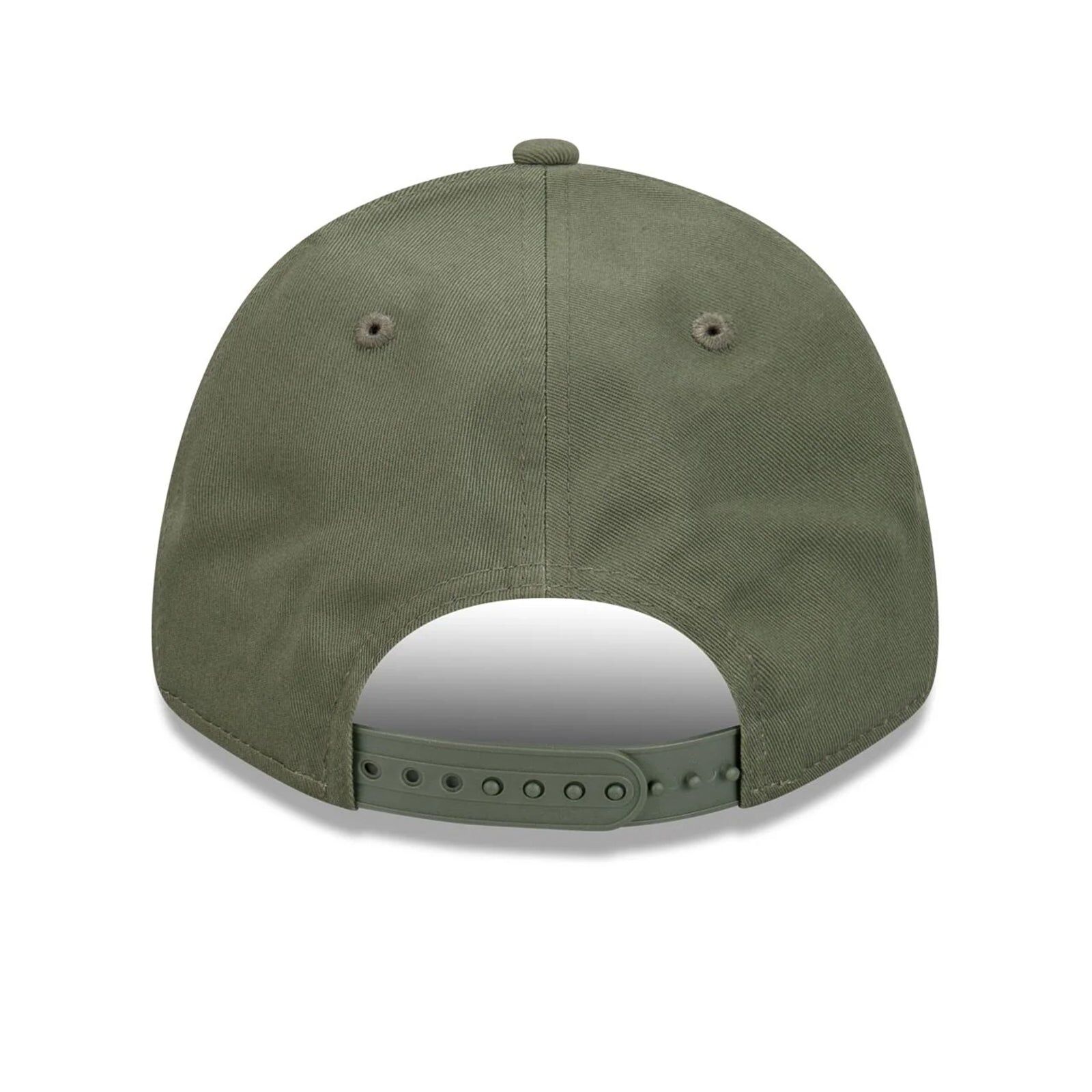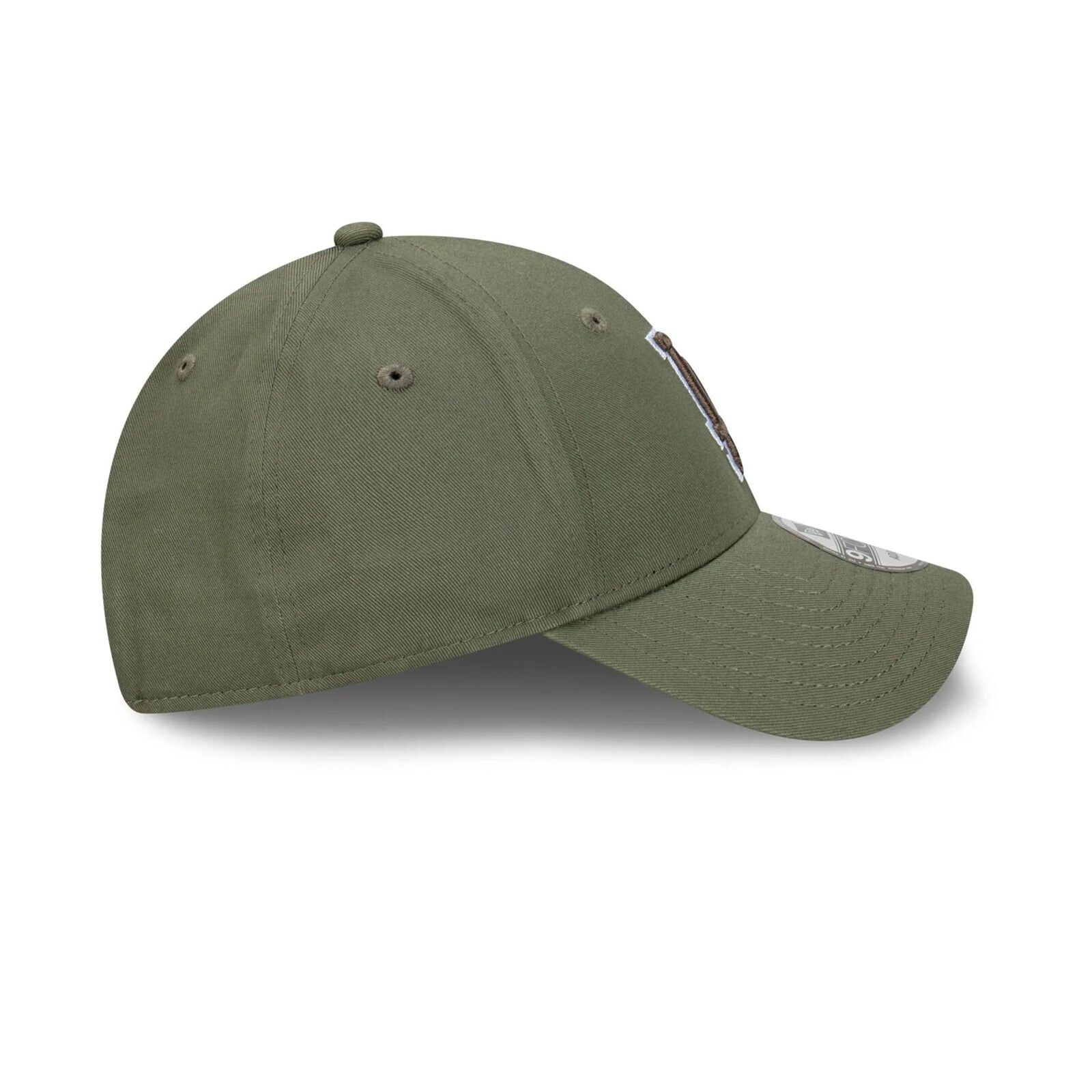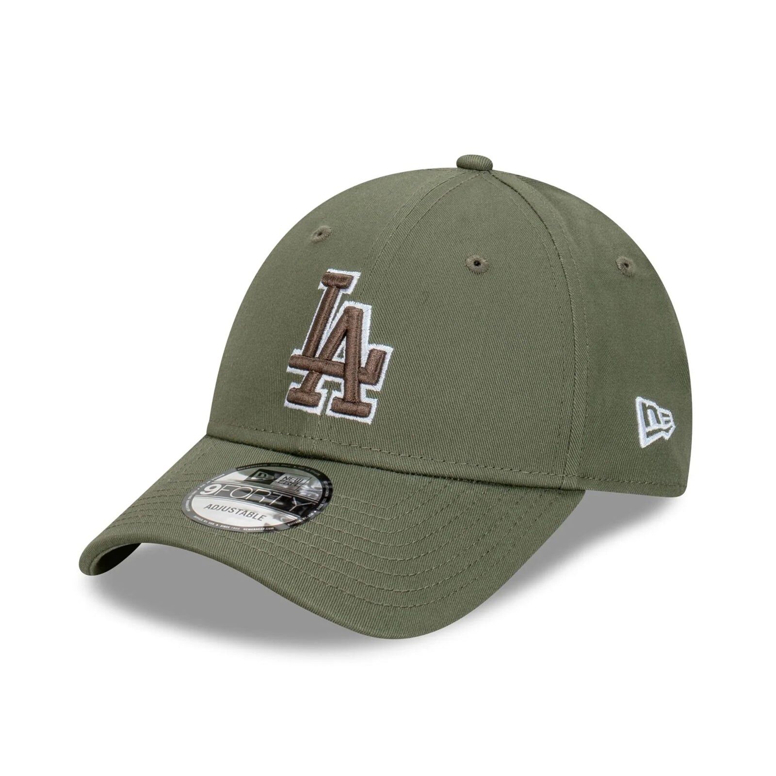 The Los Angeles Dodgers Dark Olive 9FORTY Snapback features an embroidered contrast Dodgers logo in a dark olive outline on a low-profile contoured crown, a contrast NE Flag logo on the left, and an adjustable snapback enclosure.