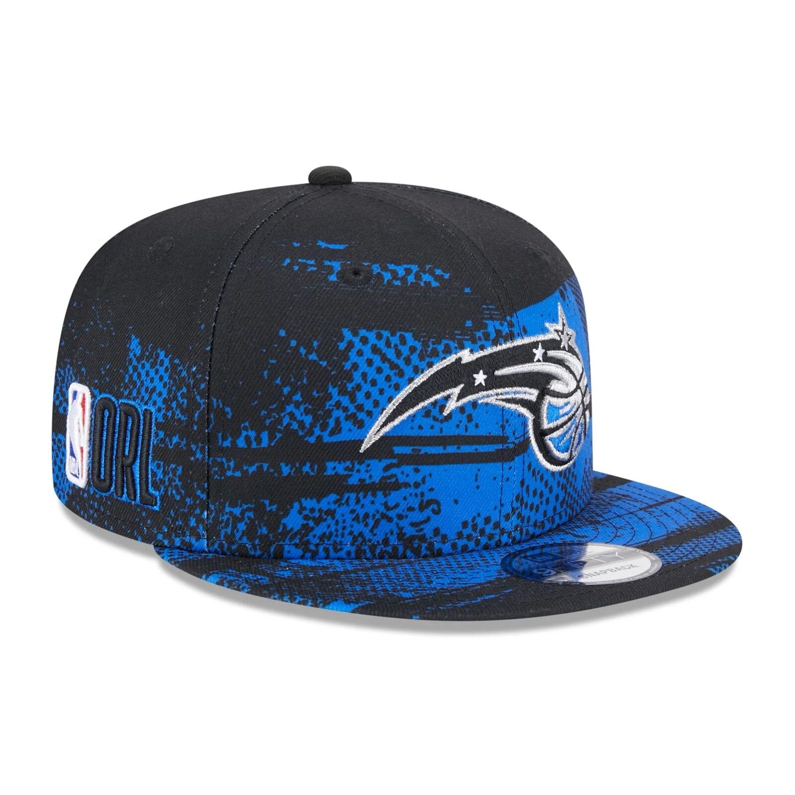 The Orlando Magic NBA Tip Off '24 9FIFTY Snapback features an embroidered Magic logo on a patterned structured crown, raised league logo with team wordmark on the right side, patterned visor, and an adjustable snapback enclosure.