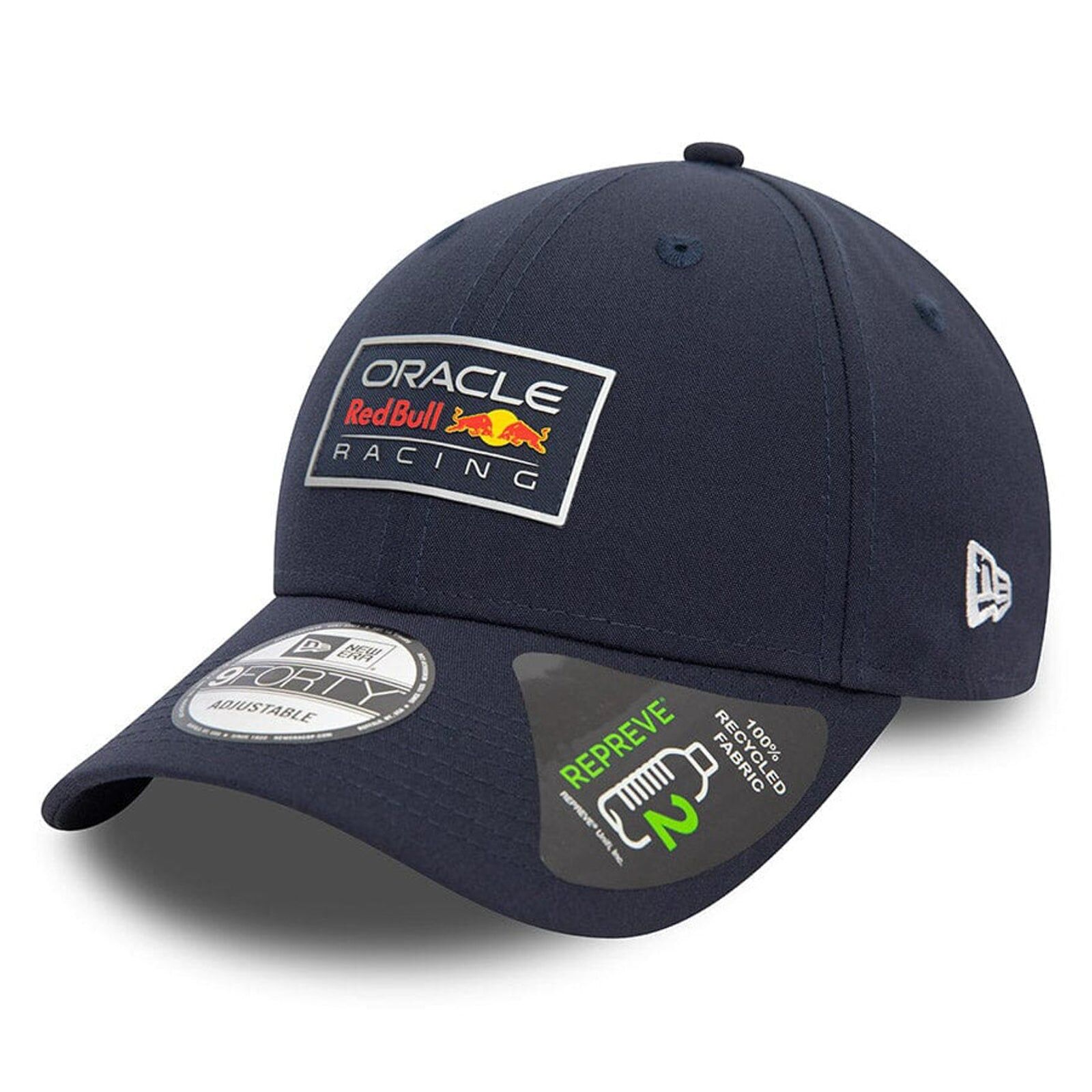 The Oracle Red Bull Racing Repreve 9FORTY Snapback features a Oracle Red Bull Racing raised wordmark block at the front panels and a screenprinted logo on the right.