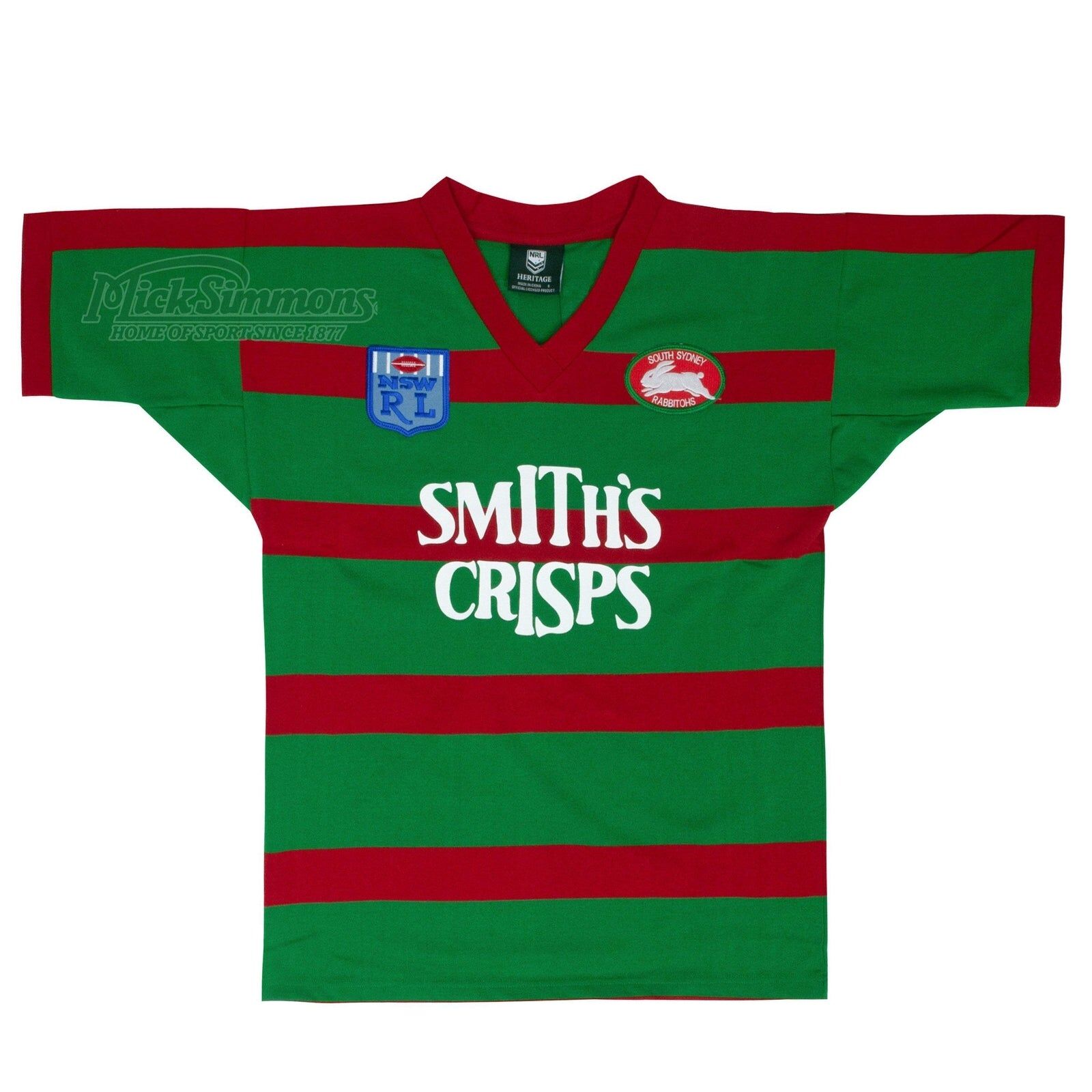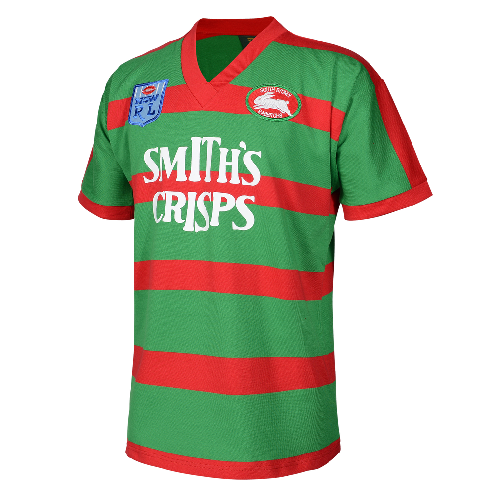 This jersey features an embroidered South's emblem and sublimated Smith's Crisps sponsor. An iconic jersey, of one of Sydney's iconic Rugby League clubs. The Bunnies were captained by Mario Fenech and coached by George Piggins. During the regular season the Rabbitohs won an amazing 18 games, drew one and lost only 3 claiming minor premiership.