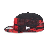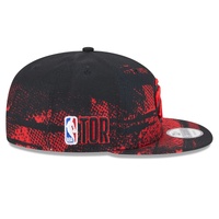 The Toronto Raptors NBA Tip Off '24 9FIFTY Snapback features an embroidered Raptors logo on a patterned structured crown, raised league logo with team wordmark on the right side, patterned visor, and an adjustable snapback enclosure.