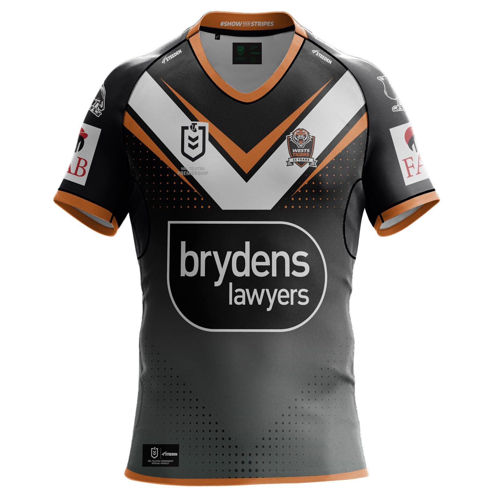 The new 2024 NRL Home jersey for the mighty Tigers. Made with high quality polyester fabric suitable for casual use, game day or training. High quality chest embroidery and sublimated logos and design. Featuring, detailed logo patches, show your love and support for the Tigers this season with the Balmain West Tigers 2024 Men's Home Jersey by Steeden. The traditional yet athletic neckline replicates exactly what the players will be sporting on match day. The body is finished with performance and bind along the hem and the wide sleeve cuffs provide a comfortable fit. The jersey utilises a fully sublimated design for focused