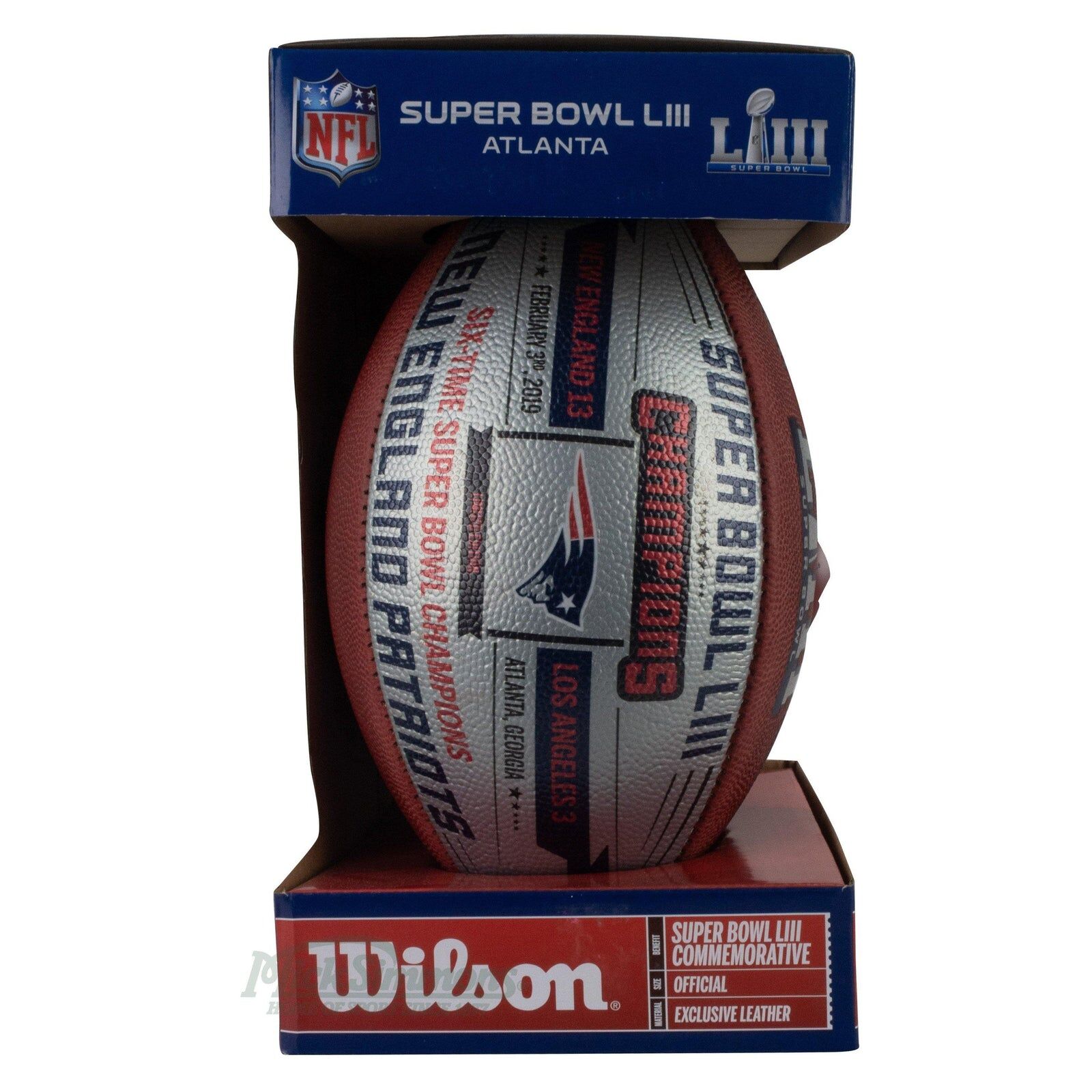 Congratulations, New England Patriots! You own the crown, and this is your chance to own a piece of the game. Handcrafted in the USA at Wilson's Football Factory in Ada, Ohio, our one-of-a-kind, leather Super Bowl ball with a commemorative metallic panel is the perfect way for a die-heard fan to celebrate the Patriots' title. As the official football of the NFL, Wilson is the only place to buy an official Super Bowl LIII Championship ball.